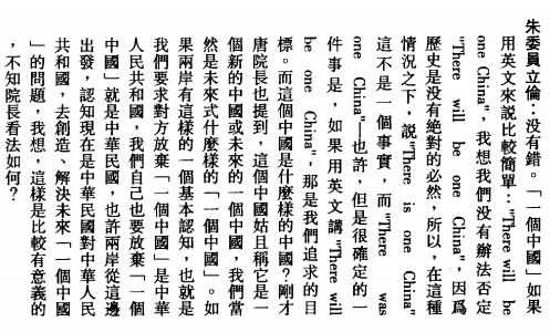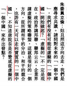 「我們有沒有可能,從虛擬的一個中國開始做起?虛擬的不一定是現在。也許有一天可以走向實質的一個中國。」 十五年後的今天,「朱習會」近了,是否代表「實質一中」也近了!? 天佑台灣! ====== 參見: 立法院公報89卷41期,頁251~256 〈朱習會?民進黨質疑逃避監督 〉http://news.ltn.com.tw/news/politics/paper/862427 〈掛羊頭賣「朱」肉 朱赴中申請文件沒提朱習會〉http://news.ltn.com.tw/news/focus/paper/875543