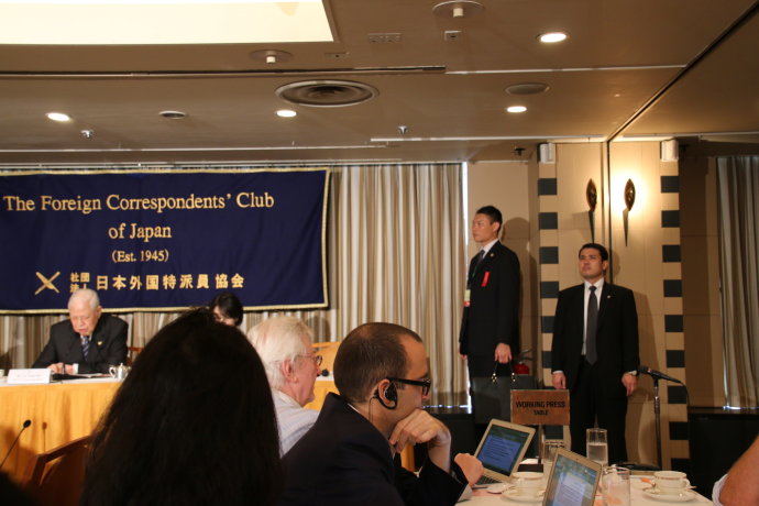 記者協會給了我一個靠近李登輝講台的座位,因此能夠聽到李登輝喝茶動刀叉的聲音。92 歲的人,總體還挺精神。看得出,日本政府給予他的待遇實在太高,完全標準的元首級安保,會場的四周,包括講台兩側,至少有8 名保鏢。我想在場的200 多名各國駐日記者和日本媒體記者是不會脫鞋子的。