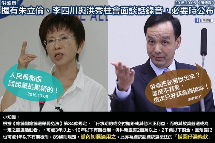 可是立倫,再怎麼想換柱,你知道搓圓仔是會出事的嗎? 法界人士指出,根據《總統副總統選舉罷免法》第84條,「行求期約或交付賄賂或其他不正利益,而約其放棄競選或為一定之競選活動者」,可處3年以上、10年以下有期徒刑,併科新臺幣2百萬以上、2千萬以下罰金,且預備犯也可處1年以下有期徒刑,89條則規定,黨內初選適用之。 此亦為總統副總統選罷法的「搓圓仔湯條款」,政黨初選同樣適用,只要有人告發就可偵辦,檢察官也可主動調查。 --- 洪陣營:握有朱立倫、李四川與洪秀柱會面談話錄音,必要時公布 http://www.storm.mg/article/68398 人民痛恨國民黨黑箱 網友:柱姐吃誠實豆沙包? http://news.ltn.com.tw/news/politics/breakingnews/1467154