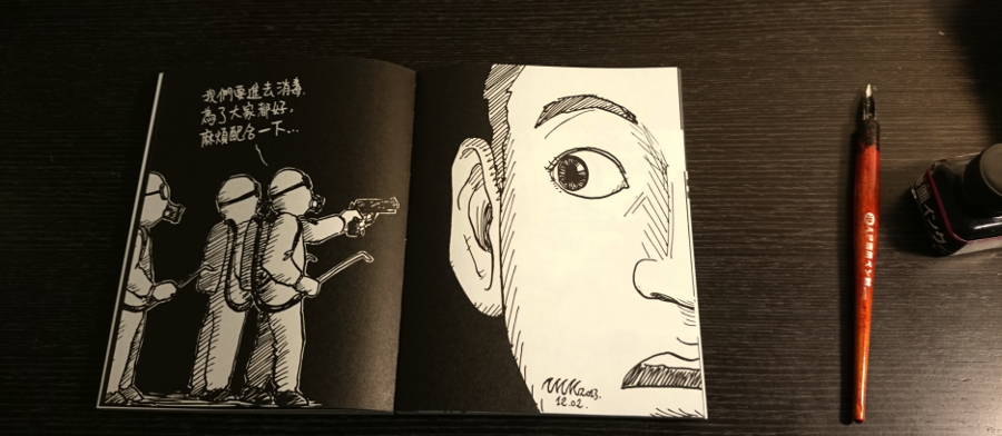 介紹了書的內容概要,也一定要有照片給各位看一下(不然就不算開箱文啦)。 首先是書的封面(圖1),這是選自《羊群》。當時畫圖的想法是:如果每個人都再勇敢一點點,我們就不需要每次都目送著那單獨的先行者去送死,然後什麼也沒改變。這張圖發表時,香港佔中運動還在進行中,所以意外地被很多港人轉貼分享。 說到書的外觀,就一定要提一下它的裝訂(圖2)。照片裡可以看到書背的裝訂線,這種裝訂可以讓各位在翻閱時比較容易把書攤平,才不會一直被「自動回彈」的內頁弄到很煩躁… XD