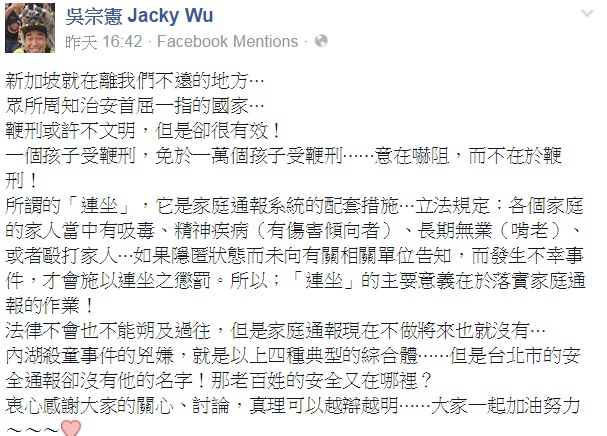 由於這已是近年來第三起的無差別殺童命案,因而引發群情激憤。號稱本土天王的諧星吳宗憲,隨後即在臉書裡PO文︰「新加坡就在離我們不遠的地方,眾所周知治安首屈一指的國家。鞭刑或許不文明,但是卻很有效!一個孩子受鞭刑,免於一萬個孩子受鞭刑。意在嚇阻,而不在於鞭刑。」