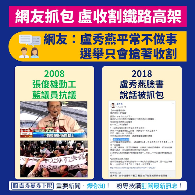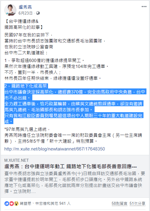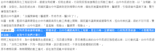 台中鐵路高架化成功讓都市縫合又邁進一步,但盧秀燕跳出來擊著說台中鐵路高架化在她的安排下完成,這番言論被網友抓包,狠狠的打臉盧秀燕,我們來看看盧秀燕如何被打臉! 以下我們先來看盧秀燕如何瞎掰: 【台中捷運綠線&鐵路高架化的故事】 盧秀燕針對台鐵高架化有三個不要臉事項: 1. 在盧的安排下和胡志強與交通部長毛治國會商 2. 由馬政府中央出錢 3. 高架後由蔡英文剪綵通車 這時我們來一一破解: 1. 台中鐵路高架化早在2008年由張俊雄動工,毛治國都是後來的事了,當初國民黨市議員拉白布抗議 (tvbs)。 2. 2008年張俊雄現場動工時,即宣布全額由中央負擔。 3. 由蔡英文剪綵很正常 台中鐵路高架化在,遠在1993年國民黨執政時便說要高架化,但規畫公司收了錢沒做事,直到2003年行政院長游錫堃到台中市召開工程會報時表示,行政院同意全額補助台中鐵路高架案,總經費達二百八十八億元。 民進黨在整理國民黨留下來的爛攤子,要馬英九來做什麼? 台中都會區鐵路高架捷運化工程 開工典禮 台中鐵路高架開工被嗆 張俊雄:尊重民意 鐵路高架趕動土 藍綠議員互嗆聲 中市鐵路高架 無預算竟開工 中市鐵路高架 無預算竟動工