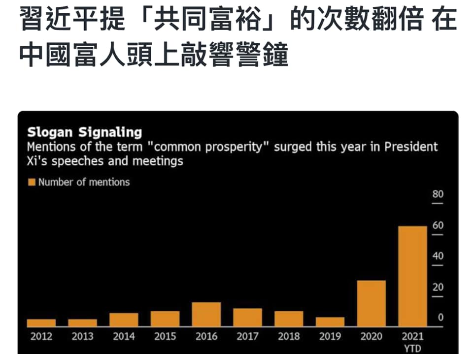 最近,最有意思的是有美國大學教授統計習近平提出「共同富裕」的次數,去年是30次今年是65次,這個次數翻倍,有如在中國富人的頭上敲警鐘,這個現象叫做「Slogan Signaling」!中國逐漸重返毛澤東時代。鄧小平時代讓少數人富起來,只要設計好制度,聰明的人必定一馬當先衝出,現在,習近平要把衝太快的人拉回來,接著要五根手指頭一樣長,這個挑戰空前大。