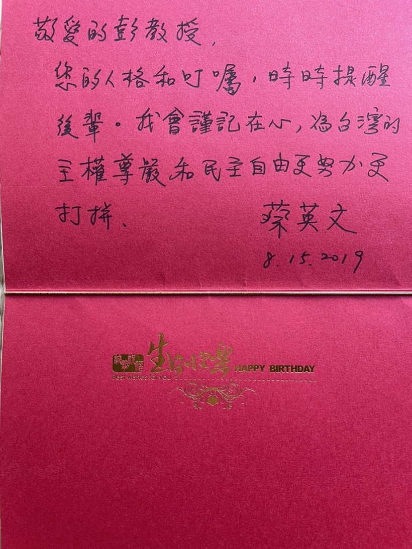 2019年8月彭明敏生日時,總統蔡英文捎來祝壽卡片,她和獨派心結逐漸化解。(攝影圖片來源/彭明敏文教基金會提供)