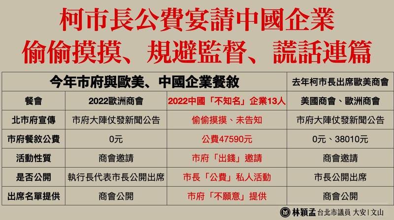 林穎孟披露,過去柯市府與歐美商會吃飯,皆是商會在台舉辦的公開活動,市府是商會邀請參加,公開透明,不像柯市長今年是自己主動拿公帑,私下和中國商人吃飯,性質完全不同,到底談了什麼,沒人知道。