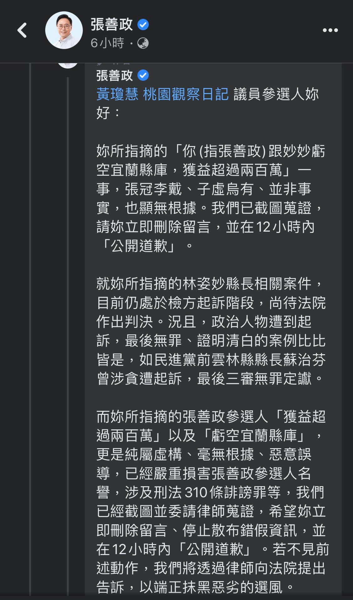 我們的鄉民女神 qn aka 黃拉結 aka 黃瓊慧 桃園觀察日記 到張善政的臉書下面留言,點出他跟林姿妙之間的關係。