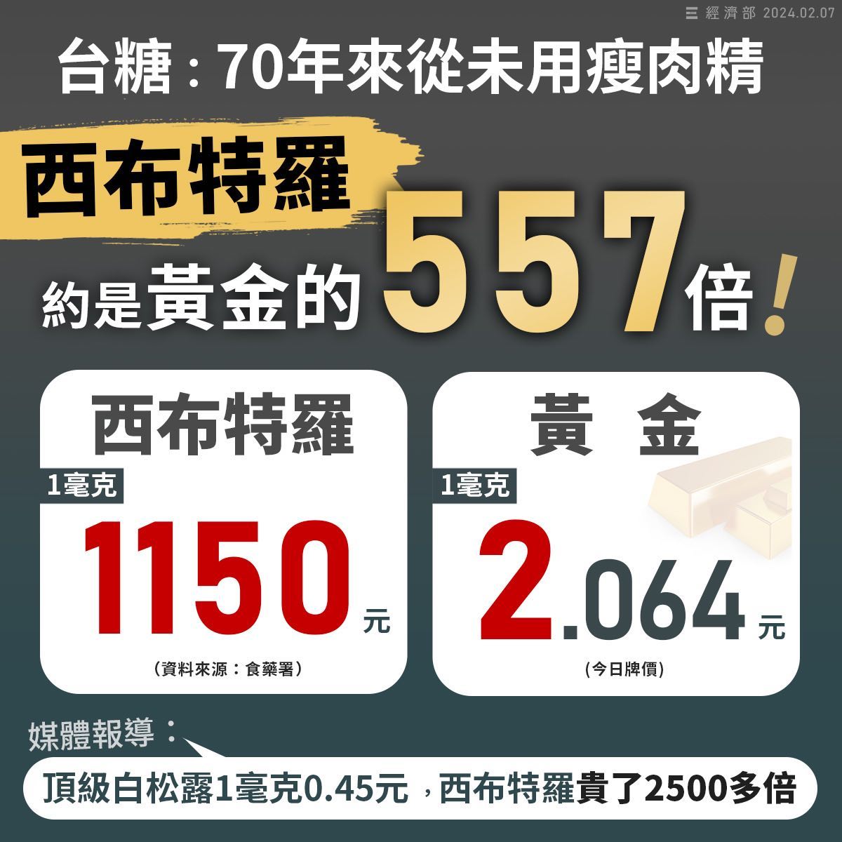 西布特羅比黃金貴! 養豬協會:根本不可能用 有人質疑台糖豬肉使用西布特羅瘦肉精,台糖公司已經再三澄清不可能。 西布特羅瘦肉精是實驗室用品,非常昂貴。依據食藥署實驗室的經驗,一毫克就要1150元,如果你用今天黃金價格比較,西布特羅不只比黃金貴,而且是黃金的557倍。 另外,根據媒體報導,頂級的白松露一毫克是0.45元,西布特羅甚至貴了超過2500倍。 驗了300多件,只有台中這一盒肉驗出,而且是極為罕見的西布特羅瘦肉精,而且是接近儀器極限值的狀態,台糖公司最希望找到答案,也一定會配合政府跟專家檢驗。