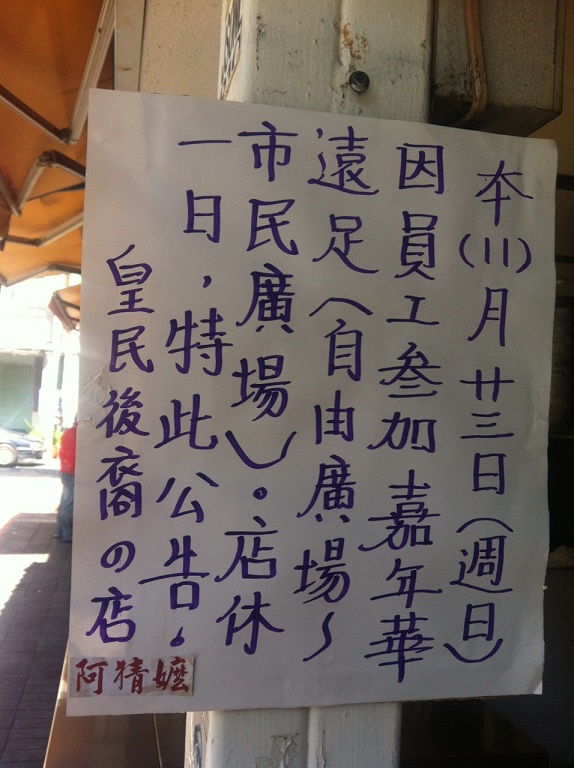 選戰太激烈,害人吃不到好料?平常生意甚好的台北華西街知名老店「阿猜嬤甜湯」,今天並非公休日卻大門深鎖,只貼上一張公告:「因員工參加嘉年華遠足(自由廣場~市民廣場),店休一日,特此公告。」最後並幽默署名:「皇民後裔の店」