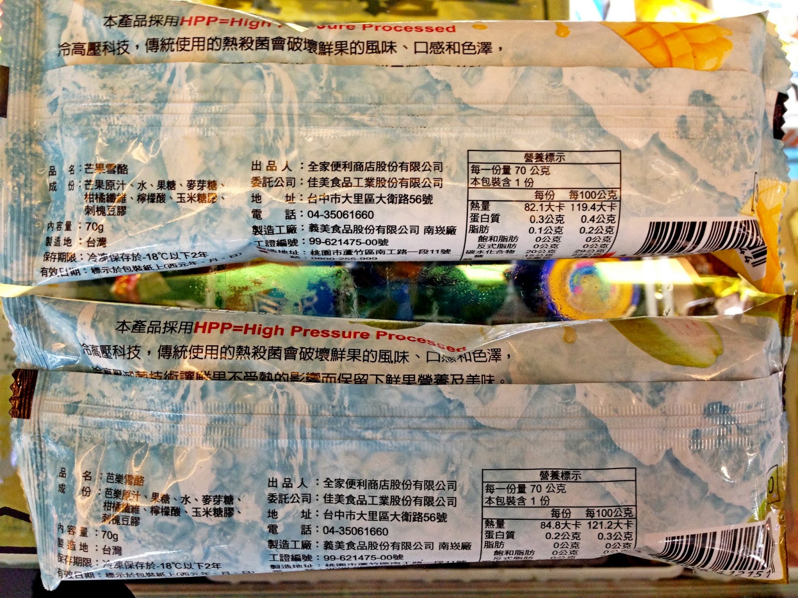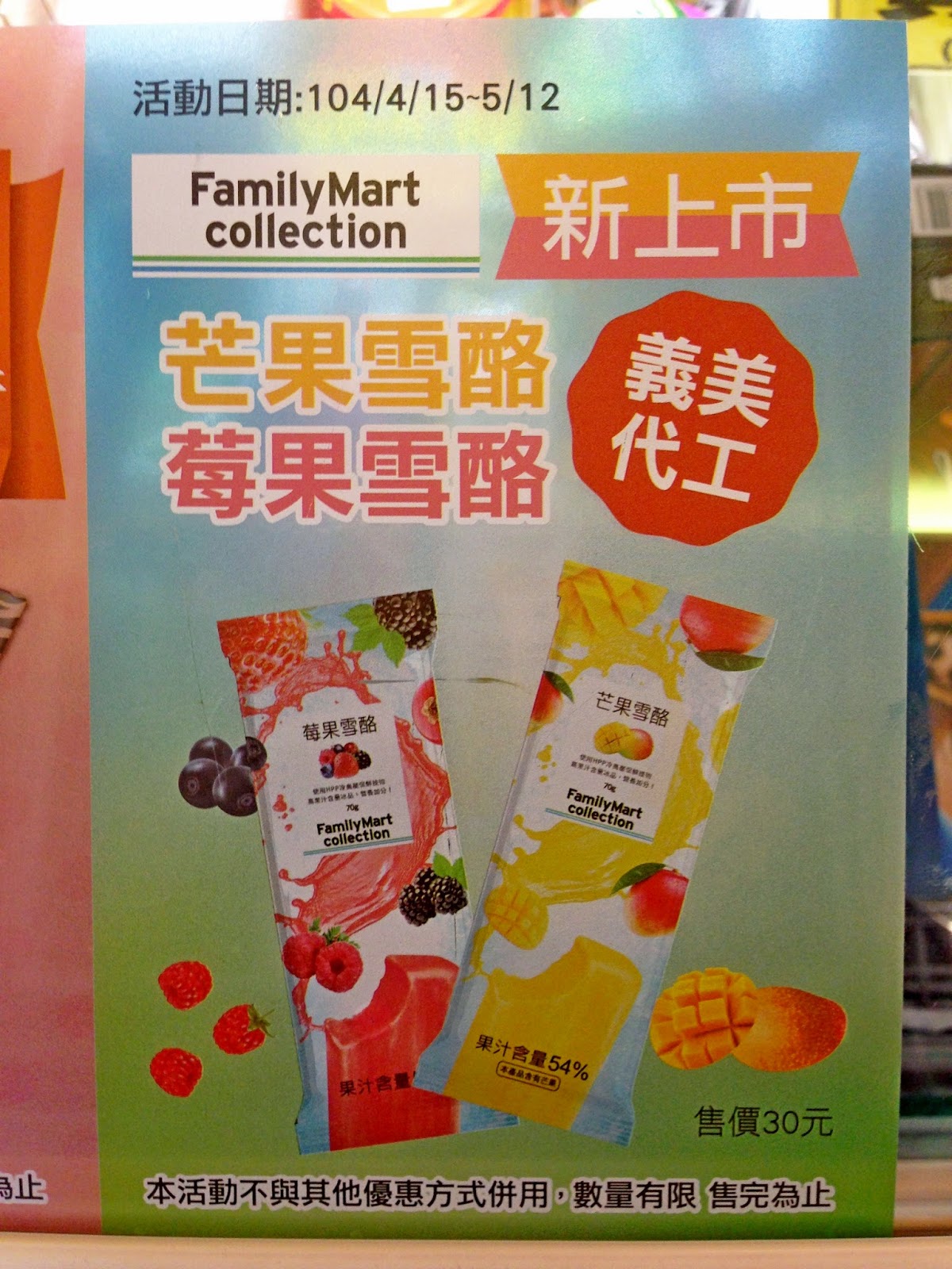 文 / 小Mic 義美豆奶於3/4日起在全家便利商店上架,銷售量超乎預期,不到1週總銷量近50萬瓶,是其他飲品的3~4倍。為回應消費者支持,全家與義美兩家企業擴大合作,包括於全家店內設立義美品牌專區,兩家深度結盟,擴大合作品項數上看百項。 4/15~5/12全家推出由義美代工的冰品:芒果雪酪54%、梅果雪酪50%、芭樂雪酪52%,果汁含量竟高達50%以上,一支還只賣30元,簡直逼人用新台幣讓它下架! 製造工廠:義美食品股份有限公司 南崁廠 芒果雪酪成份:芒果原汁、水、果糖、麥芽糖、柑橘纖維、檸檬酸、玉米糖膠、刺槐豆膠 芭樂雪酪成份:芭樂原汁、水、果糖、麥芽糖、柑橘纖維、檸檬酸、玉米糖膠、刺槐豆膠 難得看到超過50%的冰品!