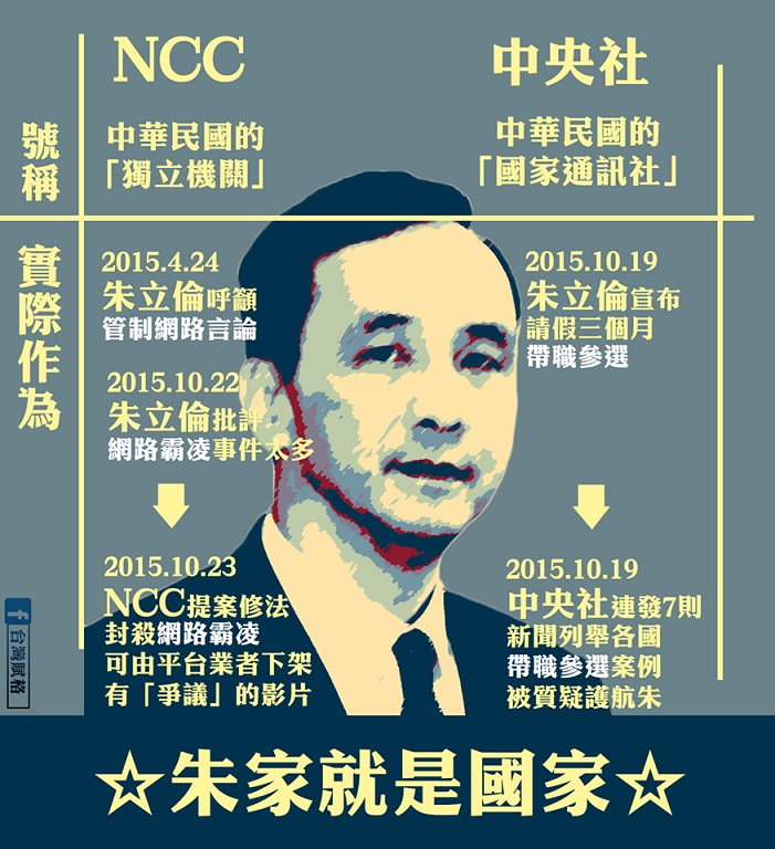 【朕即國家!?】 朱說要管網路言論,NCC就提案要管;朱說要帶職參選,中央社就發新聞說各國都有前例,這兩個單位應該要保持中立吧?是有沒有那麼巧? 參考資料: 朱立倫籲立法管網路言論 網友憂「戒嚴」恐再臨 http://news.ltn.com.tw/news/politics/breakingnews/1296727