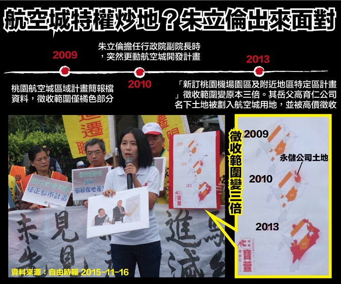 朱立倫究竟有沒有圖利家族啊?立委參選人王寶萱質疑朱立倫擔任行政院副院長期間,桃園航空城突然擴大徵收,朱的岳父高育仁所屬公司土地也被劃入航空城用地高價徵收,涉嫌圖利家族。 朱立倫圖利家族?航空城反迫遷聯盟抗議 http://news.ltn.com.tw/news/politics/breakingnews/1510071
