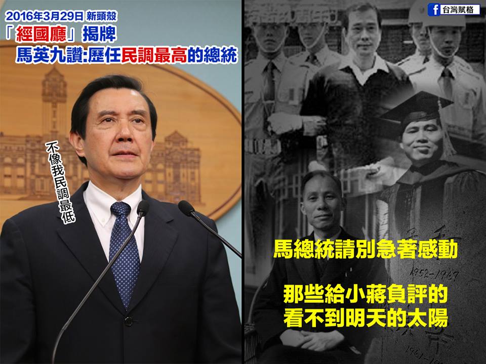 親愛的馬總統,你怎麼都只看自己想看的那一部份而已呢? #卸任前任性一回不行咩 #不行 「經國廳」揭牌 馬英九讚:歷任民調最高的總統 http://newtalk.tw/news/view/2016-03-29/71630 總統府選在29日青年節將3樓大禮堂改名「經國廳」,總統馬英九致詞表示,蔣經國的民調(應指滿意度)都在5成以上,遙遙領先其他總統。 == 【島嶼邊緣】連勝文的經國路:你不知道的蔣經國 http://www.thinkingtaiwan.com/content/3414 陳文成事件 https://goo.gl/kK6NbE