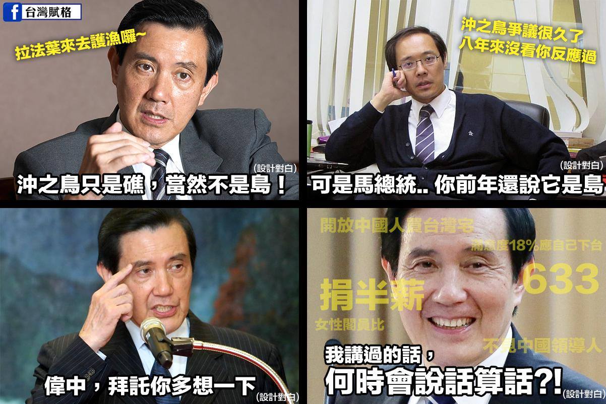 馬英九自己以前說過沖之鳥是「島」,現在卻又跳出來說只是「礁」,還被自己人打臉,不過翻開馬英九過去的紀錄,633、捐半薪、馬上好這些,好像也都只是說說而已嘛~ --- 沖之鳥爭議 楊偉中:馬總統前年稱是「島」 http://goo.gl/M0349d 沖之鳥礁爭議》涉外人員:漁業署指令前後不一 http://goo.gl/qR92kK 馬總統:沖之鳥只是礁 台灣絕不退讓 http://goo.gl/93nZaG 联合国将冲鸟礁以北海域划为日本大陆架 http://goo.gl/ndloAY