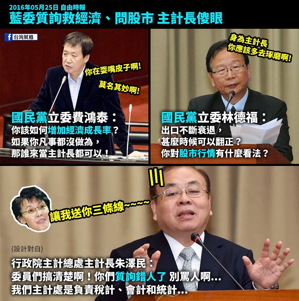 看到國民黨立委一直搞笑,小編就放心了 #但民眾剛繳出去的稅金不開心 --- 問經濟、股市找主計長?藍委又鬧烏龍 質詢搞錯對象 http://goo.gl/8yRB0L 藍委質詢救經濟、問股市 主計長傻眼 http://goo.gl/vNertY 如何增加經濟成長率? 費鴻泰質詢主計長朱澤民 http://goo.gl/lxA1SY