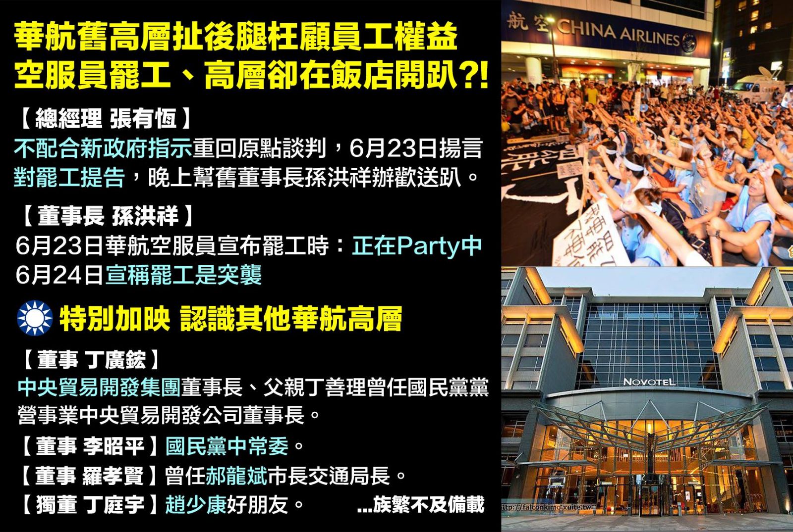 【枉顧空服員勞動權益 華航舊高層還想推卸責任嗎?】 華航空服員罷工從2016年6月24日凌晨12點開始,但昨晚空服員準備罷工時,傳出華航高層疑似在諾富特飯店開party,歡送即將卸任的董事長孫洪祥。 更誇張的是,原本民進黨政府指派,準備交接的華航準董座何煖軒,23日已指示要恢復空服員的報到舊制,華航的總經理張有恆卻視若無睹,造成抗爭越演越烈。 華航舊高層的神秘之處,還包括裡面竟然還有跟白狼一起開過記者會的國民黨中常委李昭平、國民黨黨營事業中央開發集團董事長丁廣鋐,包括前陣子桃園機場淹水,發現了機場公司竟然也充斥與國民黨相關的人馬。這也表示,這些長期受到國民黨把持的政府相關投資事業高層,或許有重新檢視的必要。 【華航舊高層】 ■董事 財團法人中華航空事業發展基金會-張有恆 不配合新政府指示重回原點談判,6月23日揚言對罷工提告,晚上疑似幫舊董事長孫洪祥辦歡送趴。 華航取消明午前8航班 公司嗆收護照將提告 https://life.tw/?app=view&no=450388 新任董事長何煖軒原想釋出善意,無奈張有恒並不搭理他,造成罷工熱度不斷升高 http://news.ltn.com.tw/news/life/breakingnews/1740044 張有恒放任罷工惡化 林全很火大! http://news.ltn.com.tw/news/politics/breakingnews/1740247 ■董事長 財團法人中華航空事業發展基金會-孫洪祥 6月23日華航空服員宣布罷工時:疑似正在Party中;6月24日宣稱罷工是突襲。 段宜康爆料 華航罷工但高層辦歡送趴 http://www.chinatimes.com/realtimenews/20160624000972-260405 華航罷工/華航董事長孫洪祥:昨天罷工是突襲 http://goo.gl/aRv0pw 華航空服大罷工董座孫洪祥向股東鞠躬致歉 http://www.ettoday.net/news/20160624/722373.htm ■董事 財團法人中華航空事業發展基金會-丁廣鋐 中央貿易開發集團董事長,父親丁善理曾任國民黨黨營事業中央貿易開發公司董事長。 ■董事 財團法人中華航空事業發展基金會-葛作亮 反對罷工的華航企業工會理事長 http://taiwan.shafaqna.com/CN/TW/495098 華航企業工會是較偏向資方的團體,長期受到空服員工會等批評 http://www.thenewslens.com/article/42391 ■董事 財團法人中華航空事業發展基金會-李國富 反對民進黨派任何煖軒 http://taiwan.shafaqna.com/CN/TW/495098 ■董事 財團法人中華航空事業發展基金會-李昭平 國民黨中常委 http://2014.kmt.org.tw/page.aspx?id=22&pid=1376 跟白狼一起開記者會 http://www.storm.mg/article/29420 ■獨立董事 羅孝賢 曾任郝龍斌市長交通局局長 http://www.coolloud.org.tw/node/8142 ■獨立董事 丁庭宇 趙少康好朋友 http://www.newtaiwan.com.tw/bulletinview.jsp?bulletinid=47166 --- 參考資料:PTT https://www.ptt.cc/bbs/Gossiping/M.1466699044.A.7EA.html