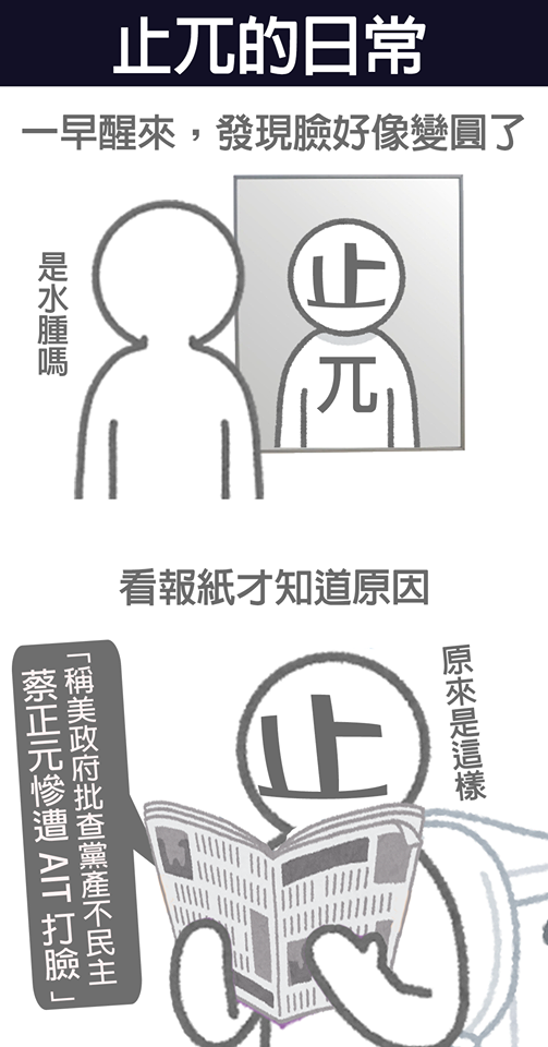 【止兀の憂】 一早醒來 發現臉 變得更圓了 看報紙才知道 原來是被AIT打臉 算了 總會習慣的 今天不是monday 心情卻很blue by止兀 --- 打臉蔡正元,AIT:美對國民黨黨產議題無立場 http://www.storm.mg/article/196053
