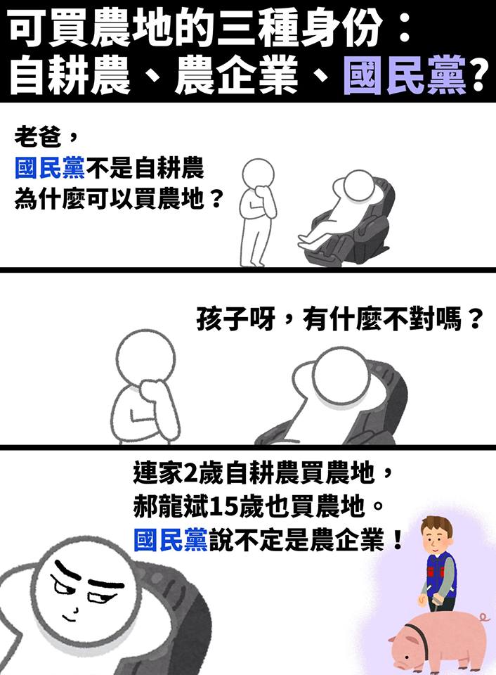 【購買農地的三種身份】 擁有什麼身份才可以承購農地?答案是自耕農、農企業.... 還有國民黨? 1950年代,國民黨未經葉姓農家同意下,佔有4筆約8393坪土地興建房舍。經葉家不斷陳情後,國民黨於1961年同意簽訂租約,每年租金僅800餘元,但葉家每年仍需負擔上千元的稅金。 之後,葉家察覺土地無法收回,只好向國民黨提議以當時公告地價的半額售予國民黨,但國民黨不接受。1962年,在4名配戴槍枝的情治人員監督下,葉家被迫以每坪105元的價格賣給國民黨。 令人不解的是,當時國民黨尚未向內政部登記為社團法人,權利主體不成立,為何能購買登記土地?另外,該筆土地為農地與旱地,根據農業管理規範,轉移對象必須是耕作行為者,然而契約中的代表是國民黨中央委員會的委員,身份是什麼?為什麼能購買農地呢? #黨證無敵 #莫非是擅長畜產的農企業? #國發院土地案 葉頌仁:國民黨非自耕農 為何可買農地? http://news.ltn.com.tw/news/politics/breakingnews/2090735