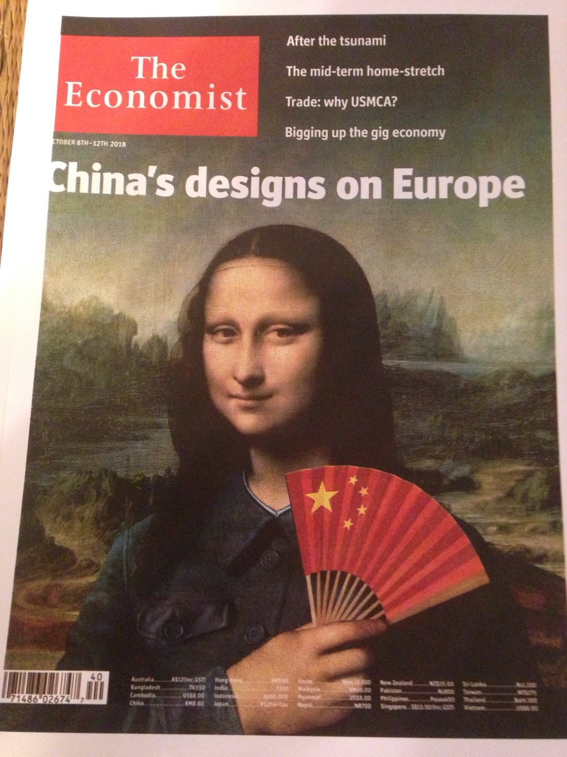 我想起這一期《經濟學人》週刊的封面,用的是達文西的「蒙娜麗莎的微笑」,只是改穿「毛裝」,而且手上多了一把「五星扇」,標題叫做「中國在歐洲的佈局」。再翻到內頁,另有一幅插圖,是一面五星旗插在「布拉格城堡」(Prague Castle) 上,我立馬想到碧雲禪寺上的五星旗。這期的主題文章就是在闡述「中國資金的大量流入,讓一些大國領袖耽心中國的實力與影響力藉此擴張,尤其是對歐盟中的小國家」,又說「歐洲看出中國正在玩『分而治之』的棋局」云云。文內列舉捷克、希臘、葡萄牙、匈牙利、義大利等國的政要或企業受到金錢攻勢而轉向,背棄國際道義;總之,「中國的投資挾帶著影響力,正在歐洲成長,歐盟總算開始注意了」。