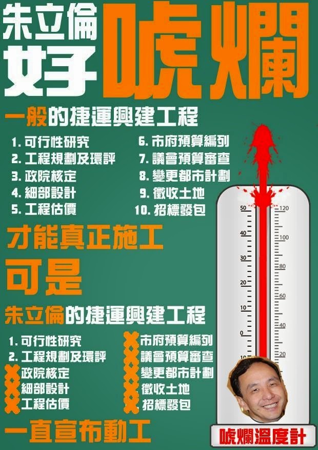 【李定宇╱新北報導】距巿長選舉投票日不到1個月,新北市長朱立倫為兌現4年前競選承諾,近來不斷舉辦捷運開工典禮,昨天捷運三鶯線 開工典禮,因三鶯線仍未獲行政院核定,遭競選對手批評「假動工、真騙票!」新北市府說:「所有捷運興建計劃皆按部就班進行中!」朱立倫因另有行程,未出席開工典禮。朱立倫4年前承諾將推動捷運三環三線,本月底市長選舉即將投票,朱為兌現競選承諾,從9月份開始就陸續舉辦淡海輕軌、民生汐止線、萬大線中和站主體工程動工,昨捷運三鶯線也舉辦開工典禮。