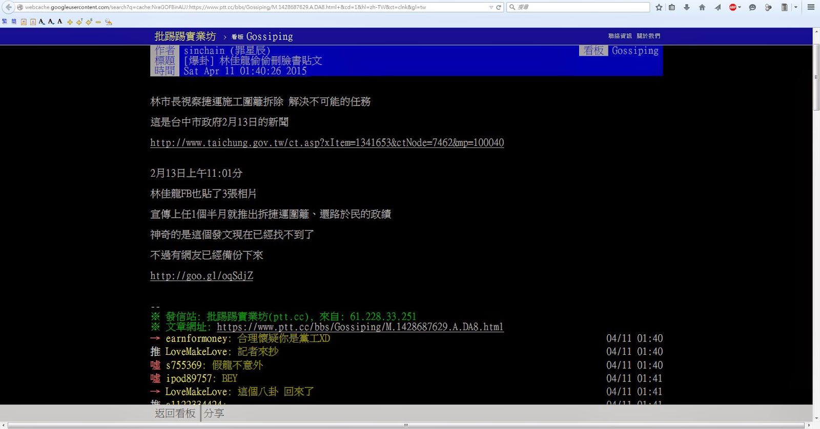 上有人在質疑同樣事情,且截下林佳龍臉書與官網新聞消失的圖片(如下圖),但撰寫時沒有附上,才讓網友質疑是從PTT上看到的。