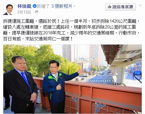 中捷綠線工程10日鋼梁掉落釀4死意外,讓在南韓參訪的台中市長林佳龍緊急返台,並負起全責。就有眼尖網友發現林佳龍曾在2月13日發表拆除捷運周遭圍籬,