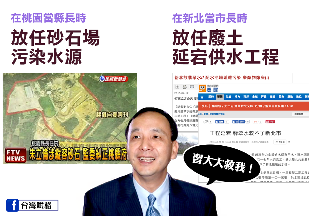 ・檢調查出掩埋廢棄物、盜採砂石時間約自1999年6月至2008年間(朱立倫2001年到2009年間擔任桃園縣長)。 ・監院發現自來水公司曾五度函請縣府查處該場疑有盜採砂石,但縣政府現勘沒看到作業機具和人員,就沒再追蹤管制。 ・至監委調查時,縣政府都未依飲用水管理條例相關規定對業者開罰。 ・縣政府未積極追蹤管制該砂石場是否已停止違法情事及恢復環境原狀。 參考資料: 桃園市和新北市最近為了用水問題隔空交戰。桃園市長鄭文燦說,用水分配不合理,關鍵問題是「板二計畫」延宕七年,至今仍未完工。 2015/04/16 NOWnews 【水資源正義 鄭文燦翻出朱立倫任桃園縣長談話】 http://www.nownews.com/n/2015/04/16/1669410 什麼是板二計畫? 板二計畫全名是「板新地區供水改善計畫二期工程」,是為了解決新北市板橋和新莊地區的供水問題。根據報導,「板二計畫規劃在板橋光復抽水加壓站附近興建一個八萬噸的配水池,將翡翠水引入配水池進行離尖峰的調蓄水量,再運送到三重、蘆洲、五股、八里、泰山等區域。」計畫完成之後,「翡翠水庫每天可提供一○一萬噸水量支援板新地區。」 參考:2015/04/12 自由時報 【新北飲翡翠水// 配水池場址遭污染 廢棄物像座山】 http://news.ltn.com.tw/news/focus/paper/871014 板二計畫延宕是誰的責任? 雖然從主管機關來看,板二計畫的主管機關是「經濟部」,主辦單位是「台水公司 」,該工程是由中央政府負責無誤。但是,該工程之所以延宕,卻主要是新北市政府的責任。 理由有二: 1. 該工程的「光復抽水加壓站用地」上面推滿了26萬方廢棄土。從2013年的評核報告中,台水公司自評工程進度落後的原因:「(1)本公司第十二區處辦理協議價購與徵收,因現場堆置26萬方廢棄土,本公司無公權力替土方棄置業者代為清除。(2)廢棄土是否含有害廢棄物疑慮未除前,本公司暫緩協議價購及徵收。」該用地推滿廢棄土,無疑是因為新北市政府疏於管理而導致。 2. 該工程的「清水加壓站」進度落後,台水公司也指出是新北市政府造成的:「清水加壓站水保始於100年10月24日送新北市政府審查,至102年10月17日方審查通過,原評59分。惟本工程水保審查歷時2年,過程超乎預期非本公司可掌握,故自評為79分。」 參考:板新地區供水改善計畫二期工程-台水公司部分(102年評核報告)http://117.56.91.94/KMPublic/readdocument.aspx?documentId=210375