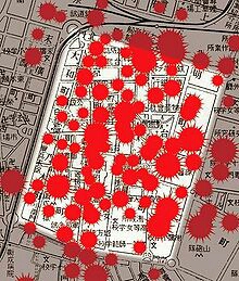 1945.05.31 臺北大空襲落彈密集度,臺北近七成五遭到破壞。