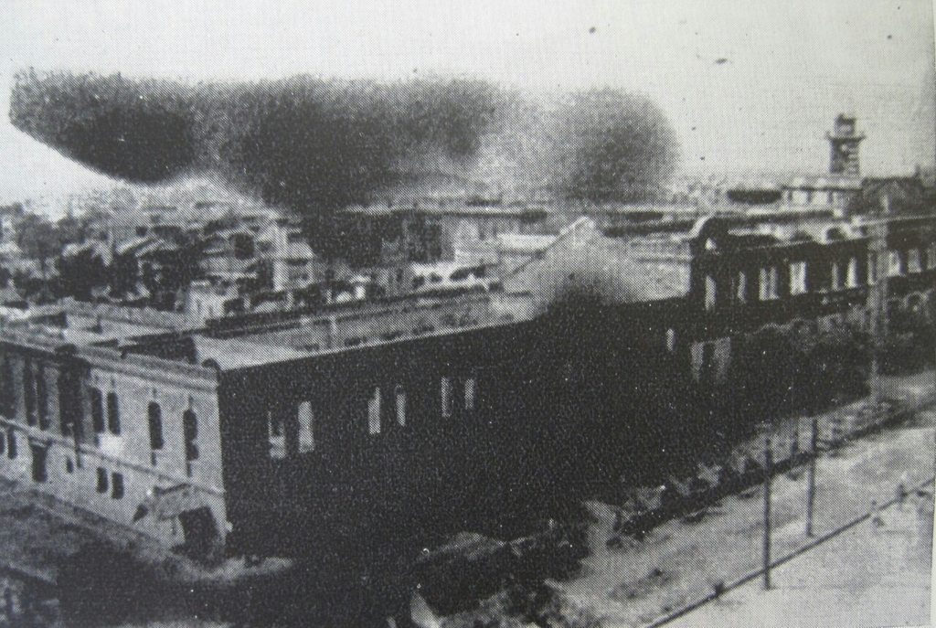 1945.05.31 臺北大空襲空拍圖,下方大煙處為總督府,左側大煙為臺北車站和臺灣鐵道飯店。