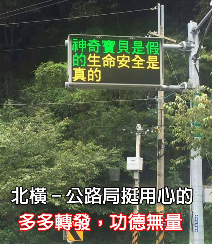 全球爆紅的手機遊戲《Pokémon GO》(精靈寶可夢)在台灣掀起一陣旋風,各大公園景點也都聚集人潮抓寶。寶可夢已推出兩週,熱度仍持續不減,北投公園、新竹南寮漁港也因稀有精靈出沒,吸引上千寶可夢玩家聚集,猶如跨年般人潮,癱瘓週邊交通。交通部公路總局就在其管轄公路的電子看板打出「神奇寶貝是假的,生命安全是真的」等標語提醒寶可夢玩家注意用路安全,讓人看了會心一笑。 圖片來源:靈異記事本(Buddhanet) 神奇寶貝是假的,生命安全是真的 延伸閱讀: 寶可夢為何讓人著迷?只因那份最單純的感動 《Pokémon GO》十大最爛的寶可夢排行榜 《Pokémon GO》十大最稀有的寶可夢排行榜 北投公園暴鯉龍出沒!寶可夢玩家集體暴衝 當北投公園出現快龍!寶可夢玩家集體暴衝 寶可夢真實版?精靈原型公開 玩寶可夢?還是被寶可夢玩? 「猜猜神奇寶貝」詐騙集團崩潰了 「Pokémon GO」到義美抓寶免費請吃茶葉蛋
