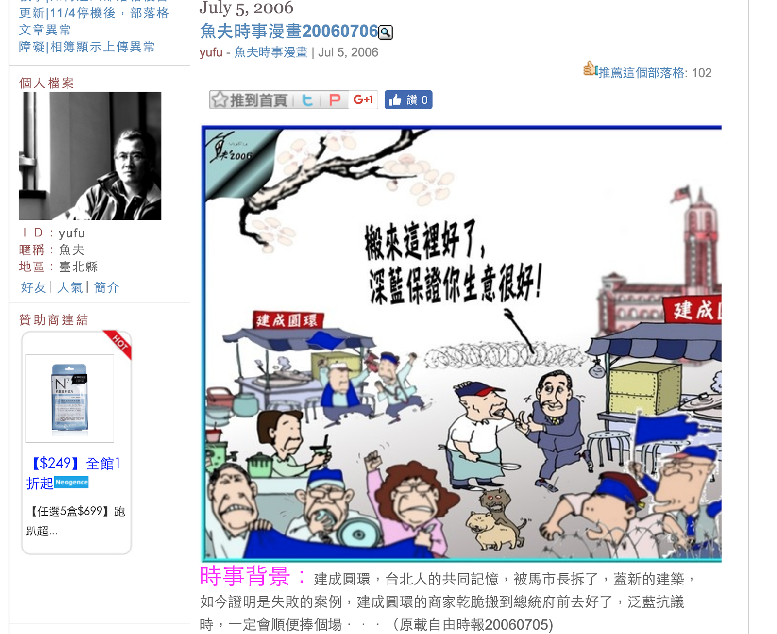 上面這張漫畫標示的時間是2006年的7月5日,我的漫畫原意是這南京西路的臺北圓環(即建成圓環)被拆了,2002年在馬英九任台北市長, 由李祖原建築師事務所設計、耗資兩億元設計一座玻璃帷幕的圓形建築,命名為「建成圓環美食館」,以美食小吃街型態於2003年10月重新開幕,可是卻因為那玻璃帷幕的構築形式,並不符合台灣小吃湯湯水水使用(又不是賣美式漢堡)而生意一落千丈,終於證明是無能的馬英九所留下的爛攤子,當時阿扁總統在任,所以建議乾脆把商家搬到總統府廣場前,若逢深藍抗議,也可以請台北市長馬英九號召深藍捧場。
