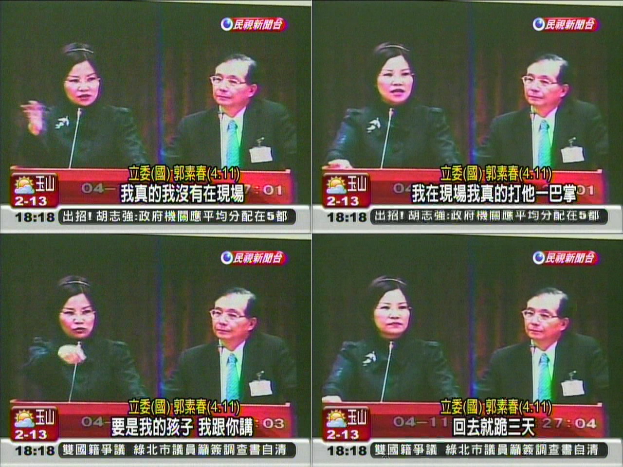 國民黨立委郭素春在立法院痛罵,指大學生見到馬英九沒有一個人站起來,讓馬英九必須彎下腰,與屁股粘在椅子上的學生對話,她聲稱要是在場的話,真的要給學生打一個巴掌,如果學生是她的孩子,回去要跪三天。哇!這個新聞太勁爆了,真的要給她Bravo,再用力按個「讚」,期待「巴掌春」多多Encore。 4月5日剛過,郭素春大概太緬懷「偉大領袖」蔣公了,期待馬英九也當個「馬公」,要大學生遇到馬英九都要「立正站好」,否則就該搧嘴皮、呼巴掌,只可惜阿春仔不是上海婆娘,不然用上海話罵「巴儂兩隻耳光吃吃(嚐嚐)」,那就更經典了。 不過,「巴掌春」唱作俱佳的表現還是比那個只會耍嘴皮開記者會罵人的羅智強火辣多了,馬英九真該換她當發言人,這樣就可與中國的外交部發言人姜瑜媲美一番呢,搞不好還可以將姜瑜比了下去,讓馬英九不要老是做細漢的。 其實郭素春也該罵罵教育部長吳清基,為什麼現在的黨國教育徹底失敗,更該罵文建會主委盛治仁,建國百年花那麼多錢都在搞什麼名堂,怎麼沒有把「蔣公」精神再發揚光大,沒讓現代的年輕人認識到黨國偉大的傳統。 為了表彰「巴掌春」這種復古熱愛黨國的情操,先為她點播現在大學生他們出生年代的兩首歌,一首是電影[少年吔,安啦!]插曲之一,由BABOO樂團林暐哲主唱的《電火柱仔》,另一首是林強[春風少年兄]專輯中的《我的頭殼有問題》。沒想到將近20年前的這兩首歌還相當呼應「巴掌春」這次的表現。 YouTube - 電火柱仔 (海洋音樂祭現場演唱版本:YouTube - 海洋音樂祭-BABoo 電火柱仔)