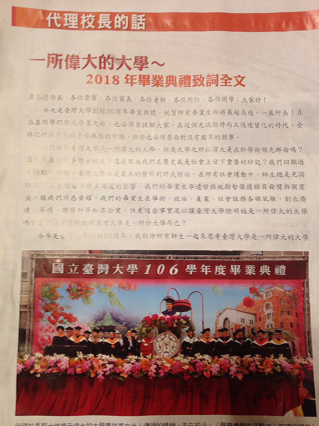 所謂「一所偉大的大學」,來自這段期間台大的代理校長郭大維之口,他在今年畢業典禮上對台大師生用這個題目做演講;這篇講稿透露出台大對管案的處理態度,讓人不勝憂慮。他直言:「現在台大陷入巨大的危機」,接著卻馬上援引「國立大學校院協會」及「私立大學校院協進會」的聲明,指責「政府不應干預遴選結果」,要求「政府尊重校務會議的決議」。郭代校長只會找一群無聊幫閒的團體來壯大聲勢、只知要求別人要尊重自己,卻說不出任何足以讓人尊重的理由;不只如此,在他領導下的台大校方行政人員,掩藏自己所有便宜行事的証據,否認自己所有違法亂紀的事實,那麽「陷入巨大的危機」,豈不只是遲早的事?把危機歸責於政府之後,郭代校長搬出一段陳腔爛調,對畢業生做廉價的期許:「身為台大的畢業生,你必須要有理想、要有榮譽感、對國家社會要有責任感、對弱勢要有同理心,⋯⋯要有雖千萬人吾往矣的精神。」說到理想、榮譽、責任、同理心、⋯⋯,高貴的大人啊,你自己有哪一樣?台大有一個管爺已經夠糟了,偏偏還有你!