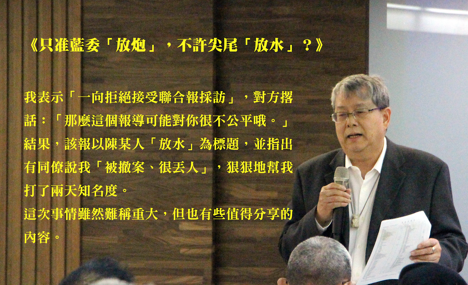 聯合報系在上個週末報導了一個監察院沒有通過的「調查報告」,是由區區在下調查的「宜蘭違規農舍加稅案」。由於本案前後任兩位民進黨籍的縣長都沒有要被彈劾,引起委員會馬系監委的不滿,要求我撤案續查,在寡不敵眾的情況下,好漢不吃眼前虧,二話不說就撤案。不料事隔一個多月,該藍媒接到本院馬委的通風報信,自以為抓到我的痛腳,派記者兩度來電要我回應,我表示「一向拒絕接受聯合報採訪」,對方撂話:「那麽這個報導可能對你很不公平哦。」結果,該報以陳某人「放水」為標題,並指出有同僚說我「被撤案、很丟人」,狠狠地幫我打了兩天知名度。這次事情雖然難稱重大,但也有些值得分享的內容。