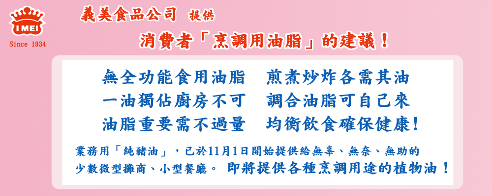 義美食品公司 提供消費者「烹調用油脂」的建議!無全功能食用油脂 煎煮炒炸各需其油一油獨佔廚房不可 調合油脂可自己來油脂重要需不過量 均衡飲食確保健康!業務用「純豬油」,已於11月1日開始提供給無辜、無奈、無助的少數微型攤商、小型餐廳。 即將提供各種烹調用途的植物油!