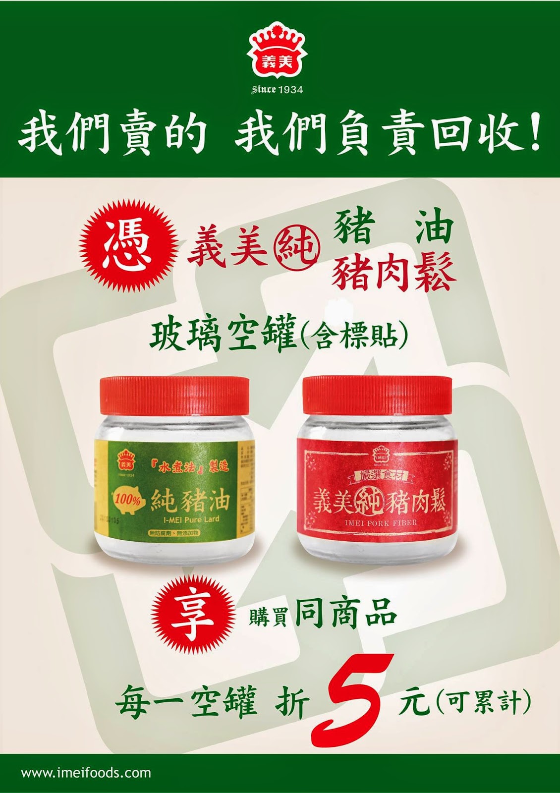 我們賣的 我們負責回收!即日起憑義美純豬油、豬肉鬆玻璃空罐(含標貼),享購買同商品每一空罐折5元(可累計)!