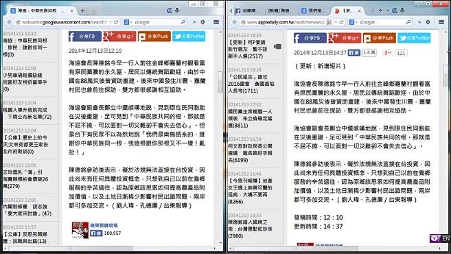 今天蘋果日報有一篇即時新聞:「海協:中華民族同根 原民:誰跟你同一根」,不過不知道為什麼後來這篇文章更新標題成「陳德銘參訪永久屋 建議原鄉提高農產價值」,而且第二段也做了更動。原本的第二段是這樣的:但現在只剩下以下文字:海協會副會長鄭立中還感嘆地說,見到原住民同胞能在災後重建,足可見到「中華民族共同的根,那就是不屈不撓,可以面對一切災難卻不會失去信心」。想看原本的全文可以參考網友所做的Youtube備份:自由時報原本也針對蘋果日報這篇即時新聞,發了一篇即時新聞:海協讚嘆兩岸同根精神 被嗆「誰跟你同一根?」,這篇新聞的連結如今也已經失效。我不知道發生了什麼事情,可能是這段太粗所以先刪掉吧,但總之先備份起來,做一個紀念囉!
