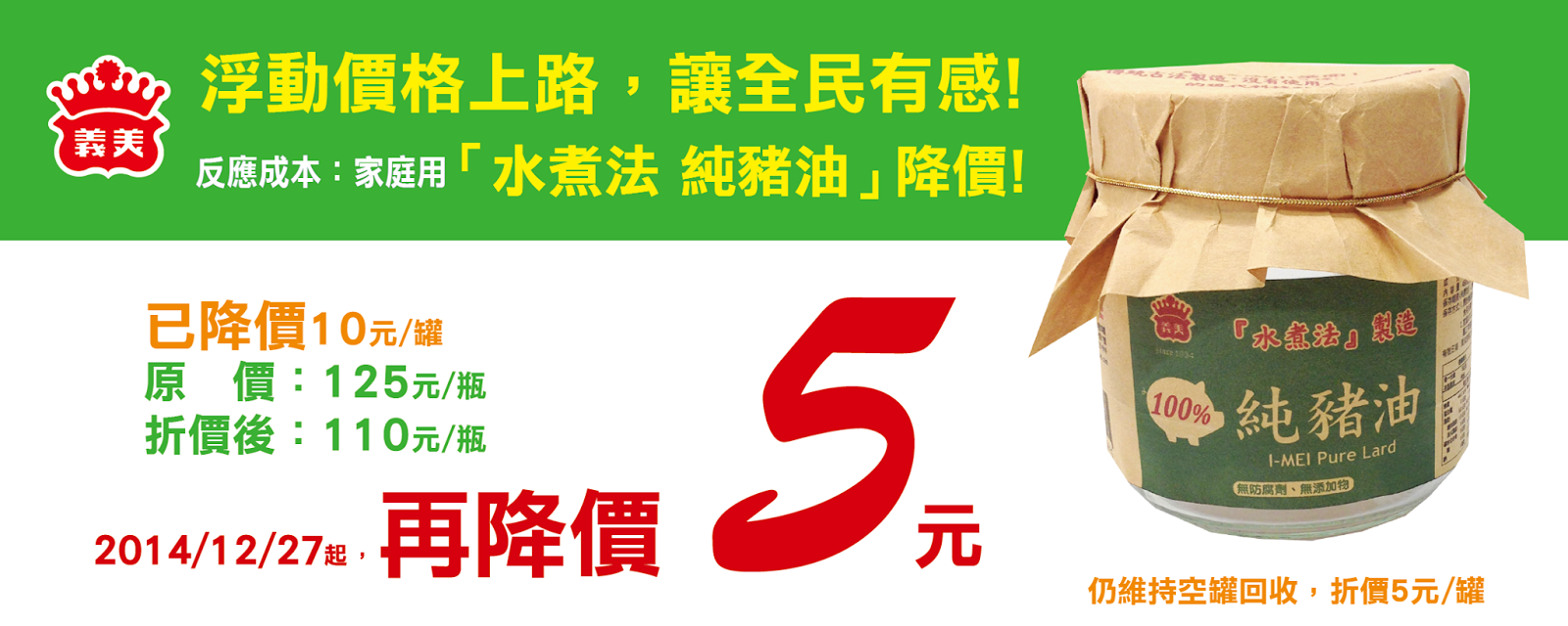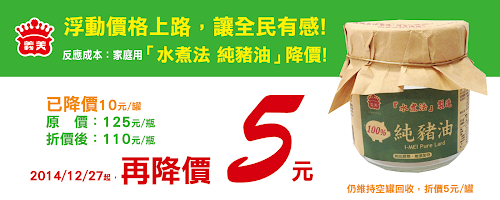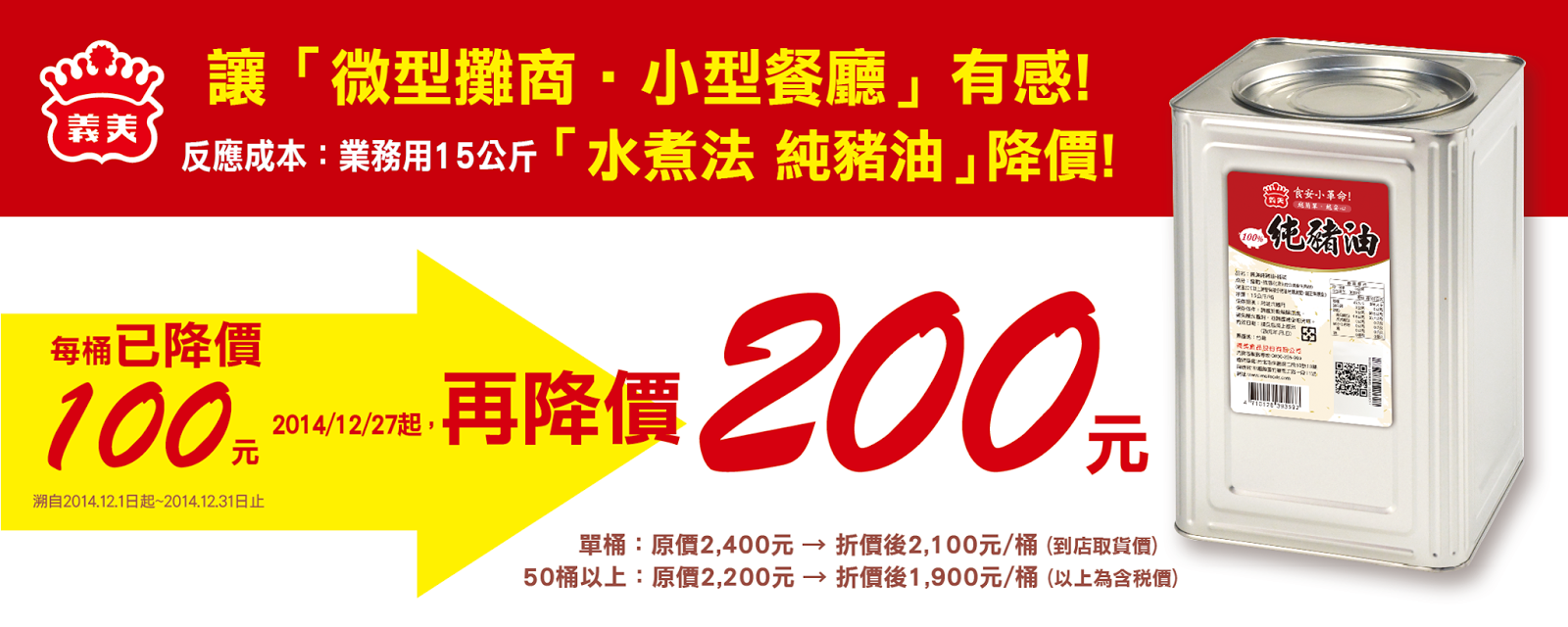 歲末好康報!浮動油格讓「微型攤商、小型餐廳」有感!!義美食品為反應成本,業務用15公斤「水煮法 純豬油」,於2014年12月27日起,再降價200元!每桶售價調整為2,100元(到店取貨價格);50桶以上,則每桶售價調整為1,900元(以上皆為含稅價)。