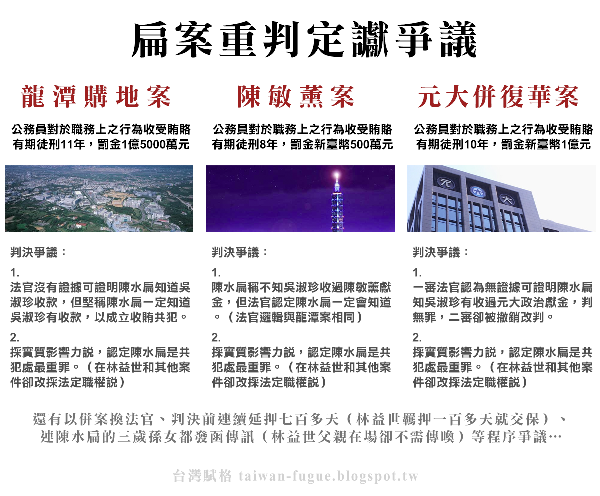 沈伯洋:阿扁到底有沒有罪(一)?陳敏薰行賄案沈伯洋:阿扁到底有沒有罪(二)?龍潭購地案法律白話文:什麼是在陳前總統判決中出現的「實質影響力說」?全面真軍:扁案程序爭議之「換法官行不行」懶人包:林益世索賄6300萬弊案,一審判決貪汙罪不成立,是法官太扯?By 魯蛇三世
