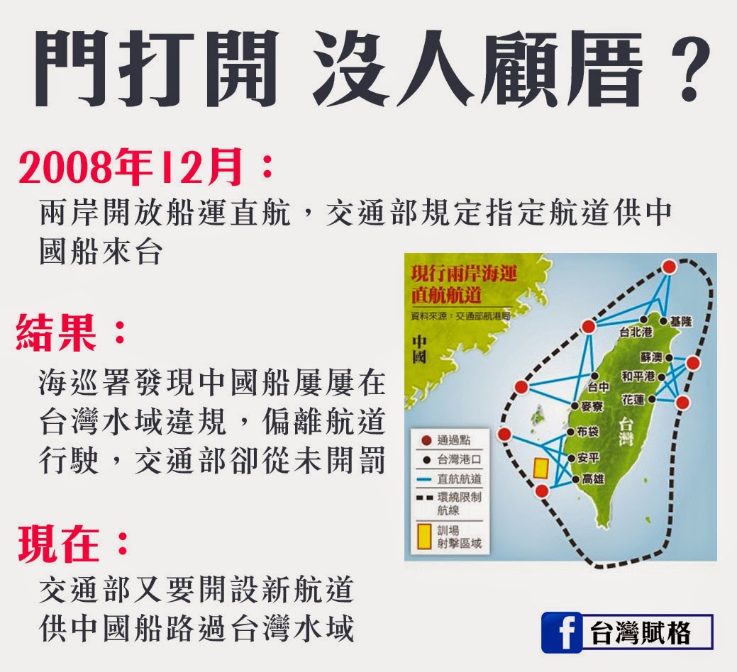 2008年12月開放兩岸海運直航,交通部在限制與禁止水域設置7個通過點、20條指定航道,讓中國船舶運送業者可行駛進入我國的港口,不過,中國船屢屢在台灣水域違規,偏離航道行駛,交通部卻從未處罰。學者質疑,現行管理已有漏洞,此次修法卻又更寬鬆,形同「門戶洞開」。