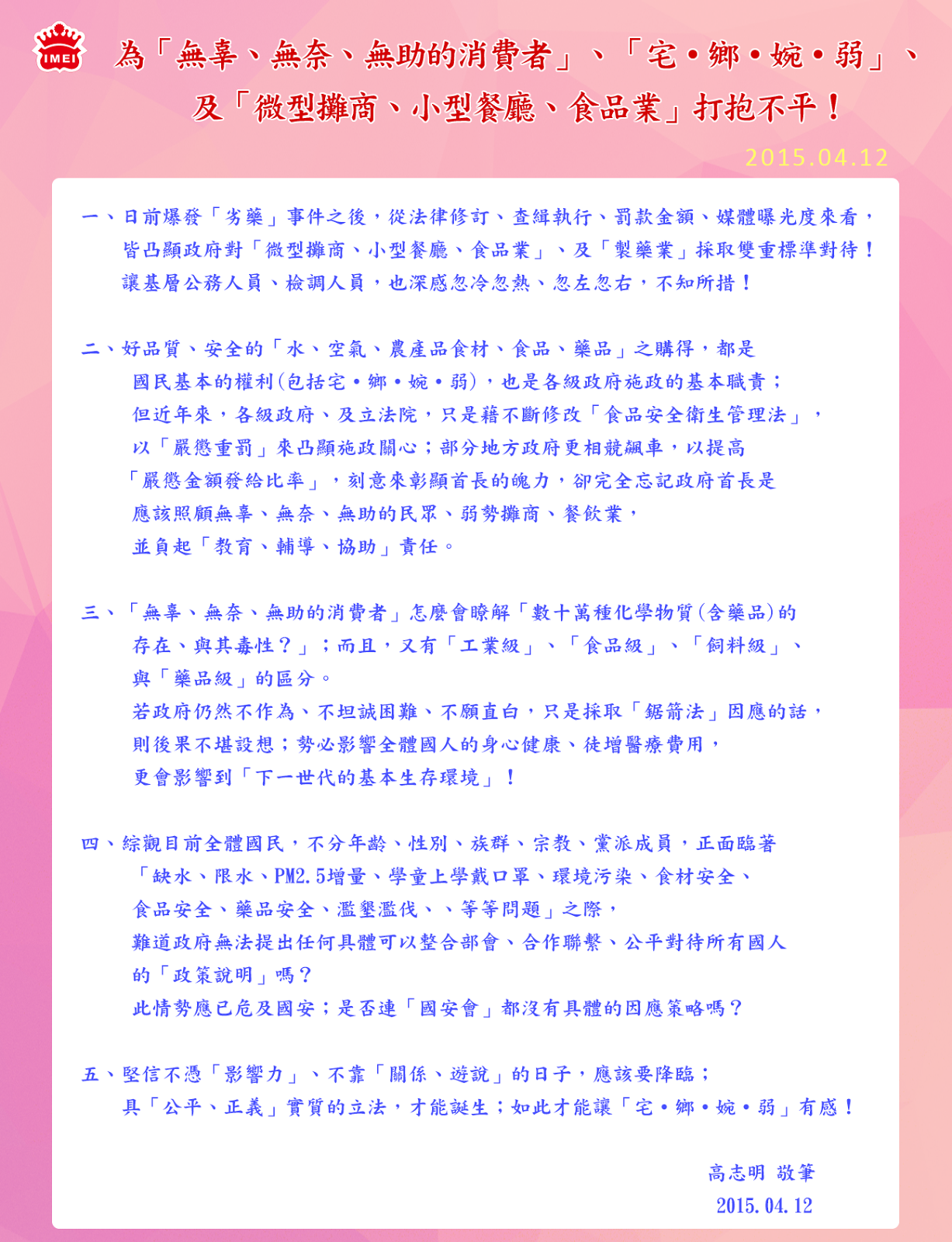 為「無辜、無奈、無助的消費者」、「宅‧鄉‧婉‧弱」、及「微型攤商、小型餐廳、食品業」打抱不平! 2015.04.12 一、日前爆發「劣藥」事件之後,從法律修訂、查緝執行、罰款金額、媒體曝光度來看,皆凸顯政府對「微型攤商、小型餐廳、食品業」、及「製藥業」採取雙重標準對待! 讓基層公務人員、檢調人員,也深感忽冷忽熱、忽左忽右,不知所措! 二、好品質、安全的「水、空氣、農產品食材、食品、藥品」之購得,都是國民基本的權利(包括宅‧鄉‧婉‧弱),也是各級政府施政的基本職責;但近年來,各級政府、及立法院,只是藉不斷修改「食品安全衛生管理法」,以「嚴懲重罰」來凸顯施政關心;部分地方政府更相競飆車,以提高「嚴懲金額發給比率」,刻意來彰顯首長的魄力,卻完全忘記政府首長是應該照顧無辜、無奈、無助的民眾、弱勢攤商、餐飲業,並負起「教育、輔導、協助」責任。 三、「無辜、無奈、無助的消費者」怎麼會瞭解「數十萬種化學物質(含藥品)的存在、與其毒性?」;而且,又有「工業級」、「食品級」、「飼料級」、與「藥品級」的區分。 若政府仍然不作為、不坦誠困難、不願直白,只是採取「鋸箭法」因應的話,則後果不堪設想;勢必影響全體國人的身心健康、徒增醫療費用,更會影響到「下一世代的基本生存環境」! 四、綜觀目前全體國民,不分年齡、性別、族群、宗教、黨派成員,正面臨著「缺水、限水、PM2.5增量、學童上學戴口罩、環境污染、食材安全、食品安全、藥品安全、濫墾濫伐、、等等問題」之際,難道政府無法提出任何具體可以整合部會、合作聯繫、公平對待所有國人的「政策說明」嗎? 此情勢應已危及國安;是否連「國安會」都沒有具體的因應策略嗎? 五、堅信不憑「影響力」、不靠「關係、遊說」的日子,應該要降臨;具「公平、正義」實質的立法,才能誕生;如此才能讓「宅‧鄉‧婉‧弱」有感! 高志明 敬筆 2015.04.12