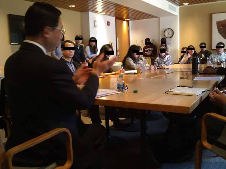 美國友人傳來這張照片,江宜樺29號下午在哈佛政治學院演講,邀請者是中國學生及學者,主題是「台灣的民主化進程對中國大陸的啟示」。