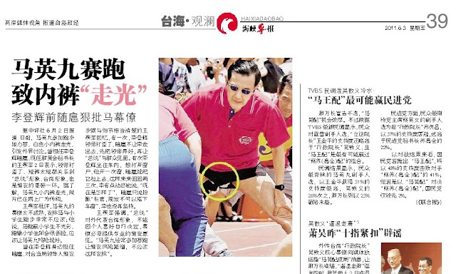 老早就厭倦寫這個又笨、又壞、又變態的傢伙,卻又有點捨不得馬英九的「來日無多」(這也是馬的用語),因為還有太多材料可以侍候他,而且很不巧,四年前的5月29日,馬英九幹了一檔超級噁爛的勾當,只好略為回顧一下。 近日,馬英九又再玩他那老狗般的把戲,夜宿陸戰旅,就是要秀老腿。其實他比「阿帕契女王」還不如,陸軍空騎旅軍紀崩壞,私授特權組觀光團,但藝人幫是想沾部隊的光,上FB炫耀一番。但馬英九反倒是拿部隊官兵當佈景,想藉此襯托他的勇健乃至英明神武。當今,有俄羅斯的普丁、北朝鮮的金正恩才搞這一套,但馬英九手法拙劣,演得像馬戲。 最幼稚的是,馬英九隔一天竟然又找小學生比劃跑步,賽後張口喘呼呼還直說「都不累」。去它的馬英九「累不累」,接連消費了精銳的勁旅及清純的學子,全世界只有這個蠢蛋才能幹出這種蠢事,能想像「統帥」與「教育」都是掌握在這個蠢蛋的身上嗎? 其實,這個蠢蛋老早就幹過類似的蠢事,而且更加離譜! 2011年5月29日,馬英九去參加台北市東園國小百週年校慶慶祝大會暨運動園遊會,竟與當時他所重用的體委會主委戴遐齡及台北市議員鍾小平等人組隊與東園國小學生比賽800公尺接力,戴遐齡過去是女子400公尺接力國手並曾參加1976年蒙特婁奧運,鍾小平則是籃球選手出身。 這次接力分成8棒之多,所以一人只跑100公尺,鍾小平負責起跑,戴遐齡排第7棒,自詡是「勇腳馬」的馬英九當然是總壓軸,準備接受終點線群眾的歡呼,而結果呢?看底下的影片吧! 20110529丟人現眼的馬英九(4m13s起為TVBS放送事故原報導) - YouTube 為了贏這次的比賽,看看馬英九等人是多麼認真地在做暖身操,抬腿、劈腿,誇張地到位,馬英九當然要戴起帥氣的墨鏡,當天更是穿上絕世獨有的祕密武器「開襠褲」上陣,這可不是「空穴來風」,是有影片有真相。 一個60好幾的老男人在眾目睽睽下穿「開襠褲」?有這麼變態?其實那條短褲也庶幾了!還記得李艷秋後來在其新聞夜總會節目中評論這則新聞時,用了個超級噁心的表情,也不知真的假的? 事過4年,對那些畫面還是覺得超級噁爛,所以影片就不放進那些比較清楚的鏡頭,生冷不忌者自行Google吧,反正「馬英九」、「露蛋」還可以找到一大堆的圖片的。 影片中絕大部分是TVBS的報導,因為TVBS播得最「清楚」,當天中午到傍晚播出的帶子,按日本用語已是「放送事故」,當晚報導雖重新剪輯,但已是覆「蛋」難收了。幾天後,壹週刊本其能耐,更大幅刊出無法說是「精采」的圖片。 而這則新聞中國的中評社也熱烈捧場,圖文並茂,所以馬英九也被他的中國大媽、大嬸同胞同樣看光光了。