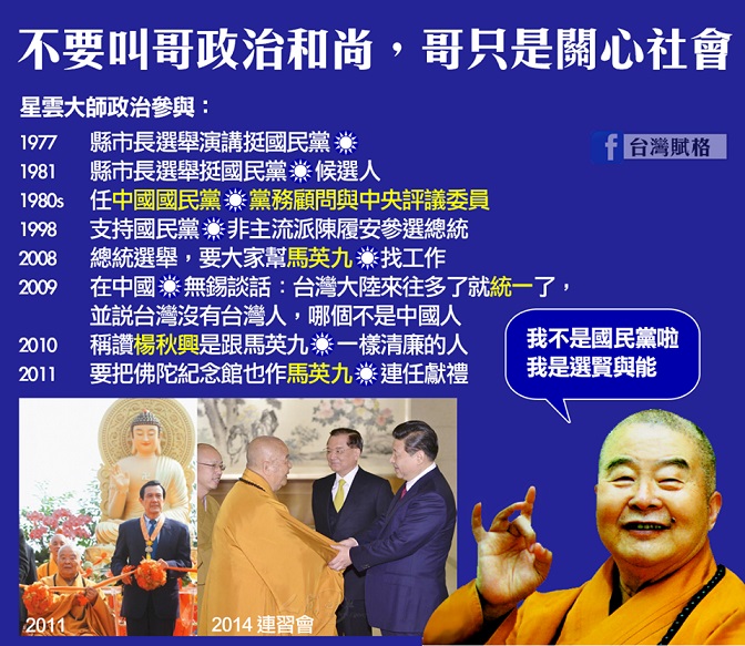 蘋果日報〈星雲大師否認屬於國民黨 網友打臉〉 http://bit.ly/1TnpEKG 更多星雲: http://taiwan-fugue.blogspot.tw/2015/06/blog-post_15.html 2008 夜訪佛光山 星雲推一把 馬:我要去找工作了 【聯合報/A4版/要聞】 星雲大師透露當年受託遊說馬英九競選台北市長的往事,在馬英九發表談話後,更語帶幽默要大家幫馬英九找工作,「如果馬先生有工作,台灣社會會更好」。 2009 星雲:台灣哪個不是中國人 【自由時報】 星雲法師在無錫談到兩岸關係時說,「我想,來往,你來我往,來往多了,誰來誰往就搞不清楚了,那就統一了;或者是你愛我、我愛你,究竟誰是你、誰是我也搞不清,誰是台灣、誰是大陸,那麼一家就統一了。」 他還表示,「兩岸一家,本來同手足一體,我在台灣說過,台灣沒有台灣人,台灣很多中國人嘛,你說台灣哪一個不是中國人?」 2010 楊秋興獲5星 星雲讚他清廉 「要讓好人出頭」 【聯合報/A2版】 佛光山開山宗長星雲大師昨天稱讚高雄縣長楊秋興勤奮、清廉,跟總統馬英九一樣都是清廉的人。 2011 星雲:作為馬英九連任獻禮‧佛陀紀念館獻給全人類 【星洲日報】 佛光山開山星雲大師說,把佛陀紀念館獻給台灣、中國及全人類,並且作為台灣總統馬英九連任的獻禮。