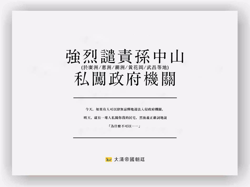 【強烈譴責孫中山私闖政府機關】 今天,如果有人可以肆無忌憚地違法入侵公署辦公室, 明天,就有一堆人私闖你我的民宅,然後義正嚴詞地說 「為什麼不可以……..」 ——大清帝國朝廷 --------------------------------------- 按:中國國民黨 KMT在Facebook發帖文批批評衝擊教育部門的反課綱學生(https://goo.gl/BqPMo7),並引用孫中山「一個人的自由,以不侵犯他人的自由為範圍,才是真自由」,表明「不挺引發仇恨、製造對立的年輕人」以及「不挺私闖特定空間、蓄意破壞社會秩序的年輕人」,故此破折號 Dash小編特意設計大清帝國朝廷的譴責聲明,,強烈譴責中國國民黨創始人孫中山在上世紀私闖政府機關!