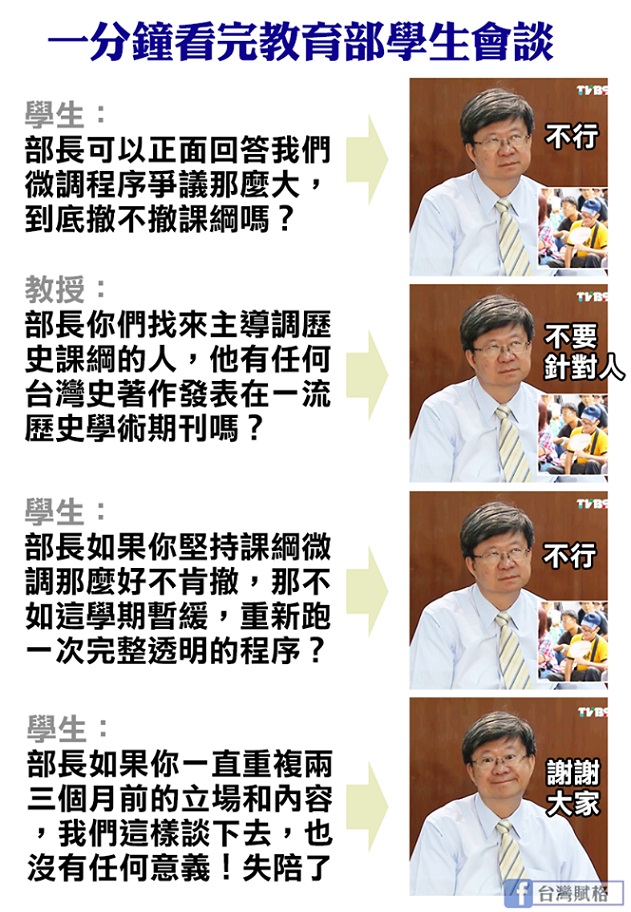 還我兩個多小時來…… 教育部長一直在跳針說可以「新舊並行」。拜託,哪有一開始先發公文恐嚇書商和學校不能選,等大家都印完選完了,才說「好,現在開始開放,不要起爭議啦」。 教部威脅書商 拿舊版供選書撤銷執照 http://news.ltn.com.tw/news/life/paper/878866 教育部最速件通告國立高中:各校「應」選用新版教科書 http://news.ltn.com.tw/news/life/paper/878865/print