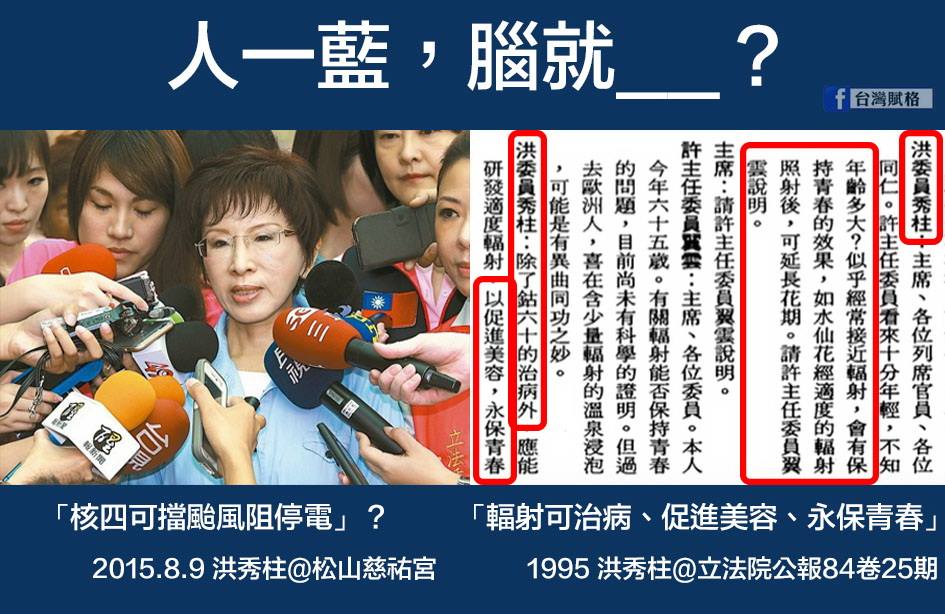 蘇迪勒颱風造成大停電,洪秀柱卻稱應該重啟核四阻停電? 柱柱姐以前力挺核四時,還曾經在立法院說核電的輻射可以「治病、促進美容、永保青春」呢。(參考:立法院公報第84卷第25期委員會記錄) 果然,人一藍,腦就__? 颱風停電柱姐不排除重啟核四 環團:白癡嗎? http://www.appledaily.com.tw/realtimenews/article/life/20150809/666032 洪秀柱「不排除重啟核四」反核團體:有空多上上課吧 http://www.storm.mg/article/61886
