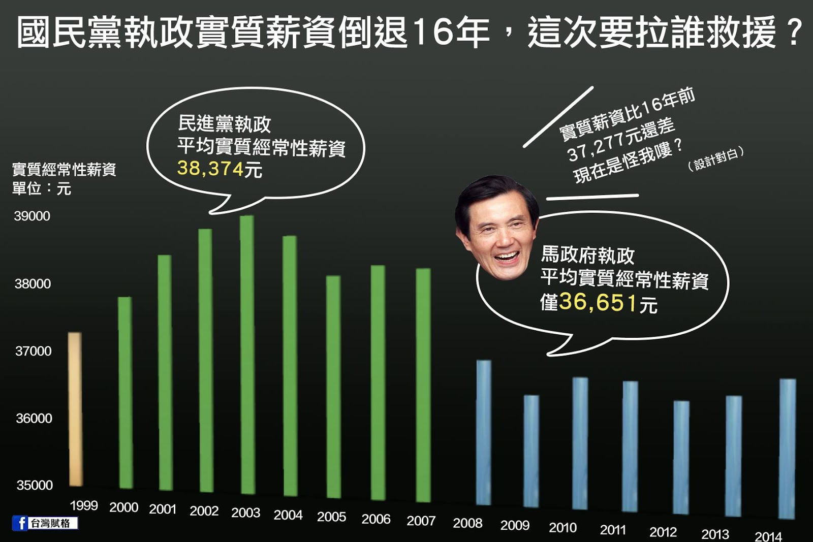 馬英九執政以來的實質經常性薪資倒退,不但比民進黨執政時低,2014年僅36749元,還比1999年的37277元更差。馬英九這次又要拉誰來救援了嗎? 參考資料: 103年12月主計總處全年薪資與生產力統計結果 http://www.dgbas.gov.tw/public/Attachment/5225164112198I9Y1K.pdf 2014年平均薪資4萬7創新高 實質薪資仍倒退16年 http://www.nownews.com/n/2015/02/26/1616603