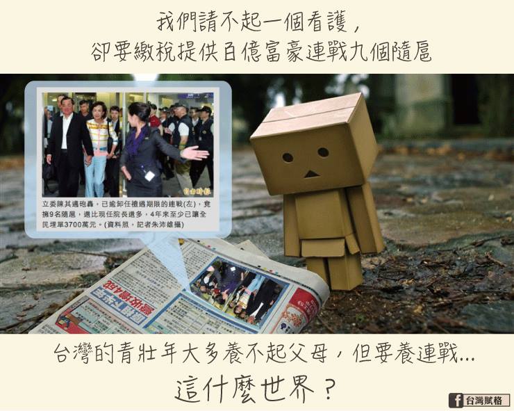 【一波未平一波又起】 臺灣的青壯年大多養不起父母,但要養連戰之二。 --- 參考資料: 連戰擁9隨扈 「耗3700萬公帑」 http://news.ltn.com.tw/news/focus/paper/914538