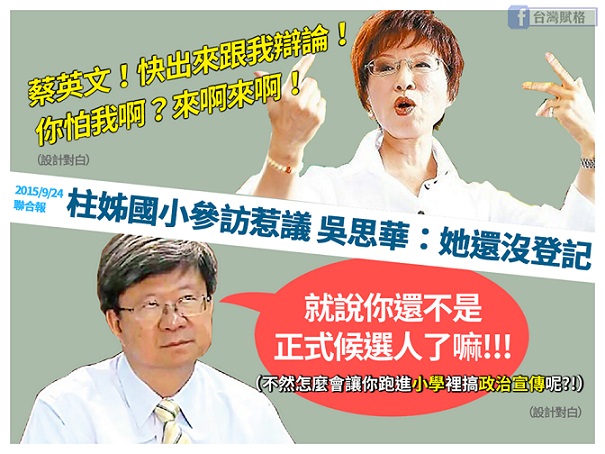 柱柱姊一直嗆小英辯論,國民黨也護航辯論說:因為大家都是總統候選人。(可是萬一柱姊辯論後不登記參選怎麼辦?) 現在柱姊跑去學校,結果國民黨政府又護航不違法:因為洪不是正式總統候選人。國民黨搞得我頭好痛啊。