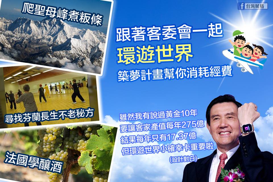 【想出國嗎~快報名客委會築夢計畫,就有機會一起爬聖母峰煮粄條喔!】 馬英九開出黃金十年支票,要讓客家產值年達275億,不但做不到,還被立委質疑,客委會辦的「築夢計畫」申請內容太過浮濫,連爬聖母峰、到芬蘭找長生不老秘方、到法國學釀酒都可以說是「發揚客家」! --- 參考資料: 聖母峰煮粄條、找長生不老術都補助! 客委會挨轟散財童子 http://www.setn.com/news.aspx?newsid=98099 爬聖母峰推廣客家事務? 綠委:客委會錢太多 http://goo.gl/AMIOOe